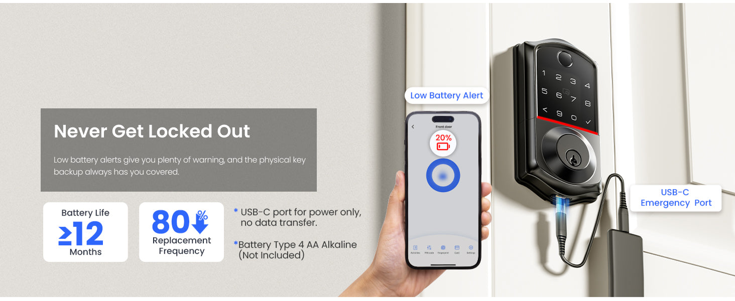 - ≥12 Months Battery Life: Veise smart door lock runs on 4 AA alkaline batteries (not included) for about 12 months. Battery life may vary based on how often you use the lock