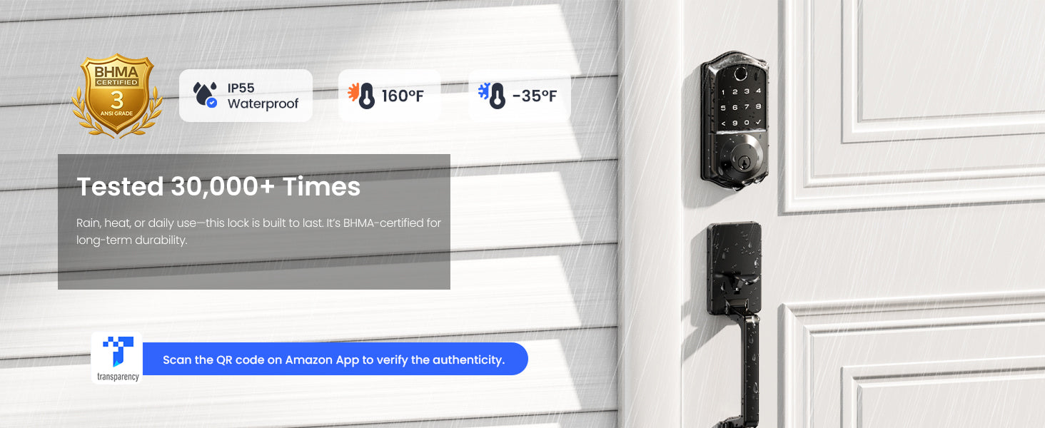 - Effortless Setup: Auto-detects left-/right-handed doors. Quick DIY installation in just 15 minutes with only a screwdriver—no drilling, professional installation, or hardwiring needed. Comes with an all-zinc alloy, all-metal, scratch-resistant, and wear-resistant smart lock, meeting BHMA/ANSI certification standards. IP55 waterproof and dustproof design withstands extreme temperatures (-35℉ to 160℉) and is resistant to wind, rain, and sun exposure, suitable for both interior and entrance doors. Compatible lock hole diameter: 1-1/2" or 2-1/8" (38mm or 54mm). Fits most standard door thicknesses from 1-3/8" to 2" (35mm–50mm). Includes installation instructions and video tutorials